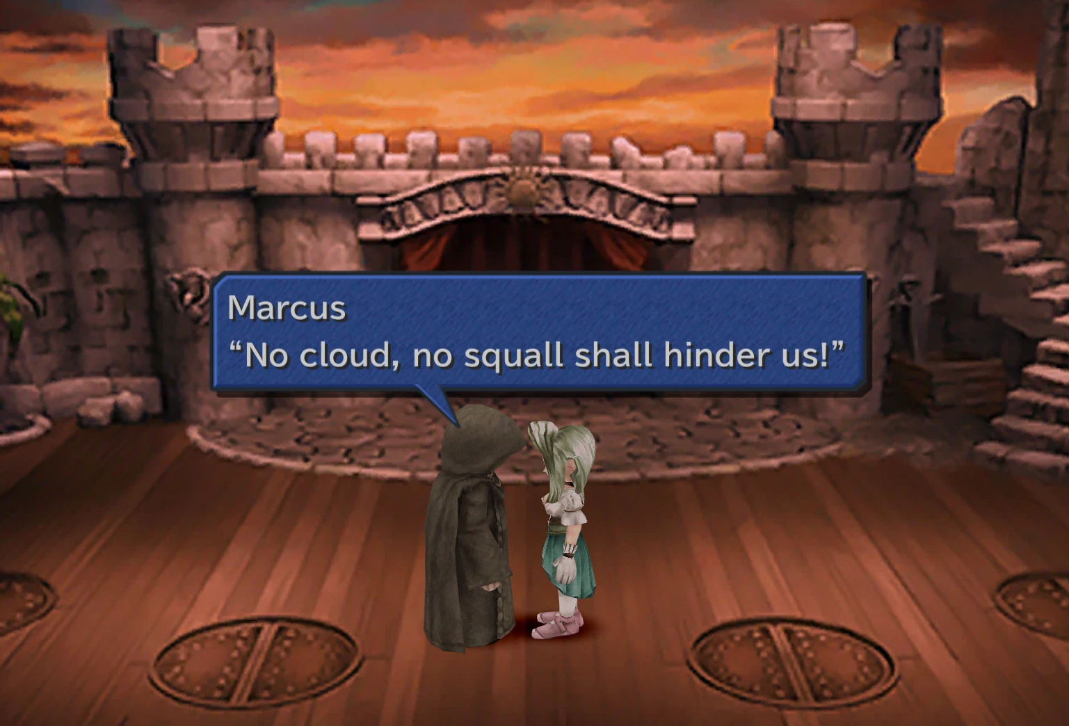 During the ending, one of the lines of the play is, "No cloud, no squall shall hinder us". This is an allusion to the protagonists of Final Fantasy VII and Final Fantasy VIII, Cloud Strife and Squall Leonhart. This allusion is only in the English version, the original Japanese being「もちろんだ、たとえ雨が降っても嵐が来ても!, which translates "Of course, not even rain or a storm can stop us!".