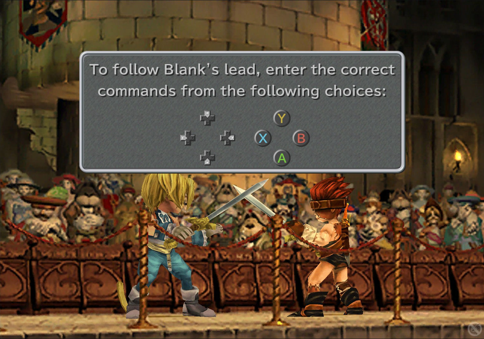 Depending on how well the player does, a number of nobles in the audience are impressed, as well as the queen. Later, when the player is in control of Steiner, they receive a reward if they talk to the queen. Button pressing accuracy alone is not enough to get 100; speedy input is required as well. Failing to input the button in time will count as a missed action, as if the player had input the incorrect button. Perfect button input is not required to impress all 100 nobles, although performances in which Zidane frequently performs the backflip action, or Zidane and Blank clank their swords, seem to provide better noble reactions. Queen Brahne will only be impressed by a perfect performance.