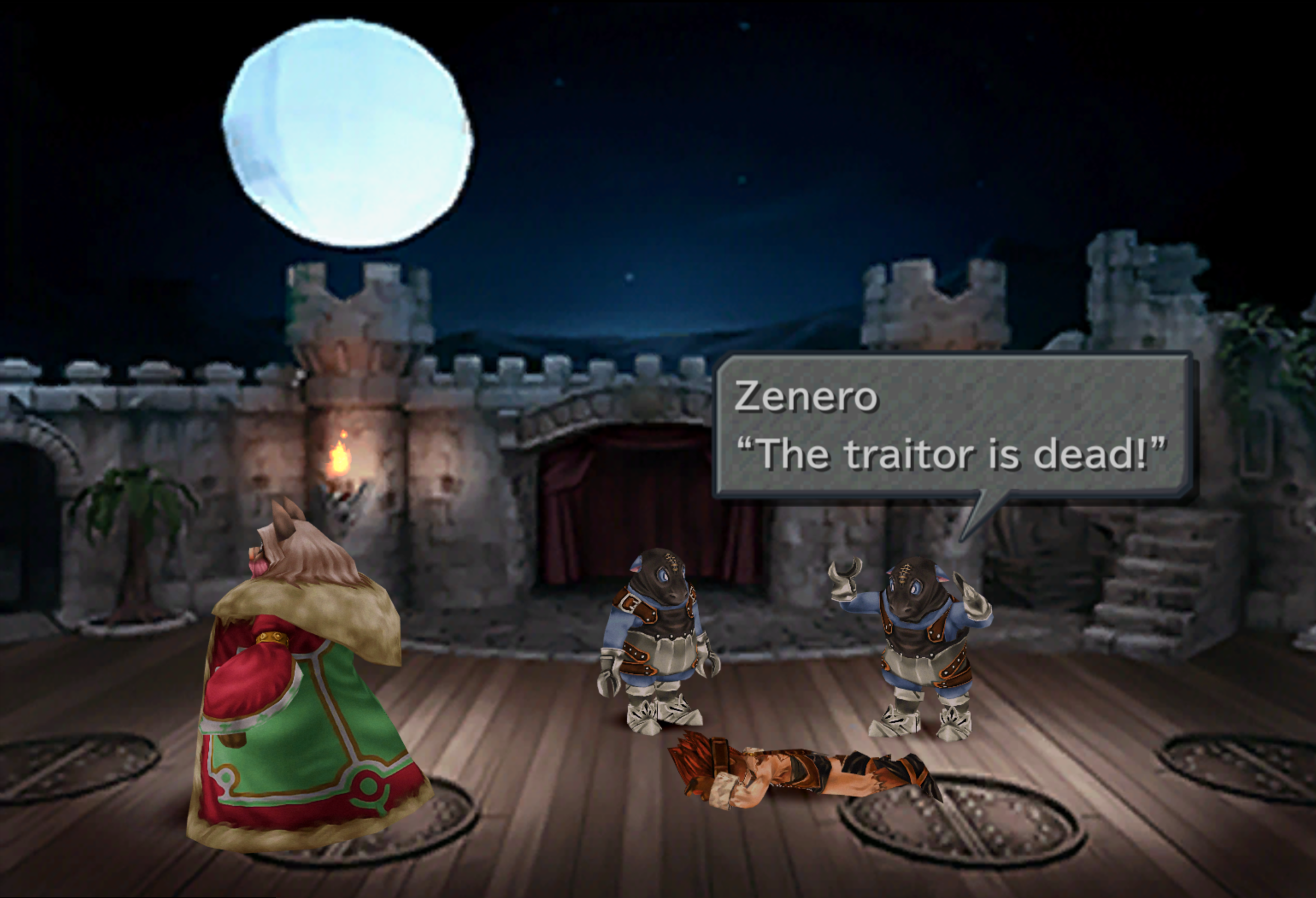 During a fight scene two Tantalus members, Zidane and Blank, slip into the audience and into the castle itself where they run into Garnet in disguise under a red and white cloak. They follow her, but are spotted by Adelbert Steiner, the captain of the Knights of Pluto, who begins his pursuit. They distract him with oglops Marcus brought with him, and sneak into Prima Vista.