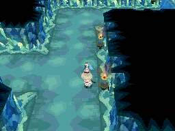 Both the western and eastern entrances can be entered from visible entry points on the world map, whereas the northern entrance to the Ice Caverns is not visible on the world map, but must be accessed by walking directly into the mountain range from the ledge above the southern exit towards Invidia. While inside the Ice Caverns, the player must use candles to melt the walls of ice to get around.