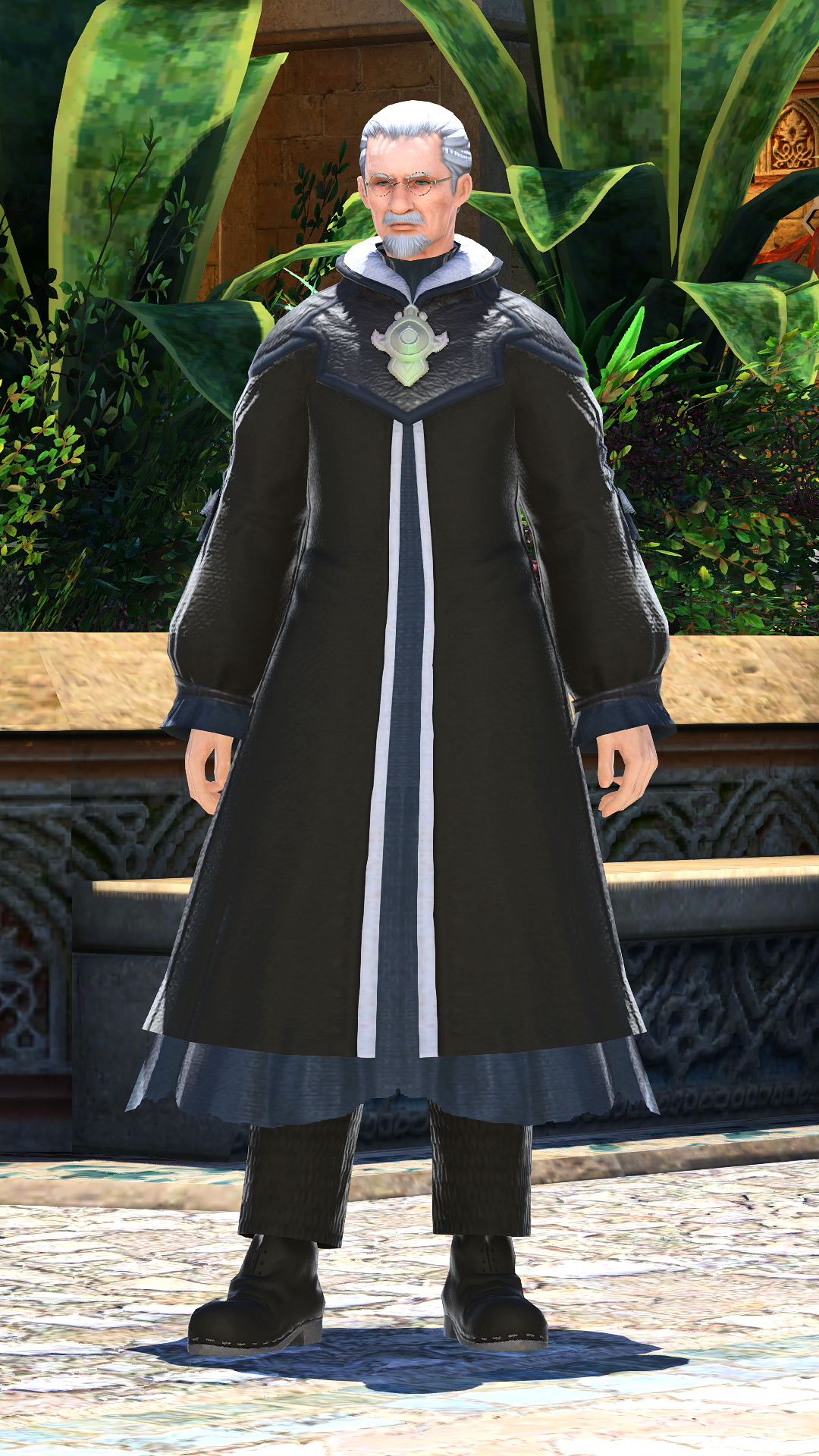 Iliud is a old Midlander hyur with short gray hair and a beard. He wears round glasses, and a long black robe.