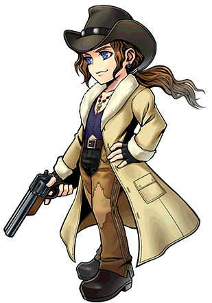 Irvine has a black cowboy hat, a purple vest, a long khaki-colored jacket, black fingerless gloves and brown chaps over black trousers with black boots. He wears gray earrings and a red and yellow beaded necklace.