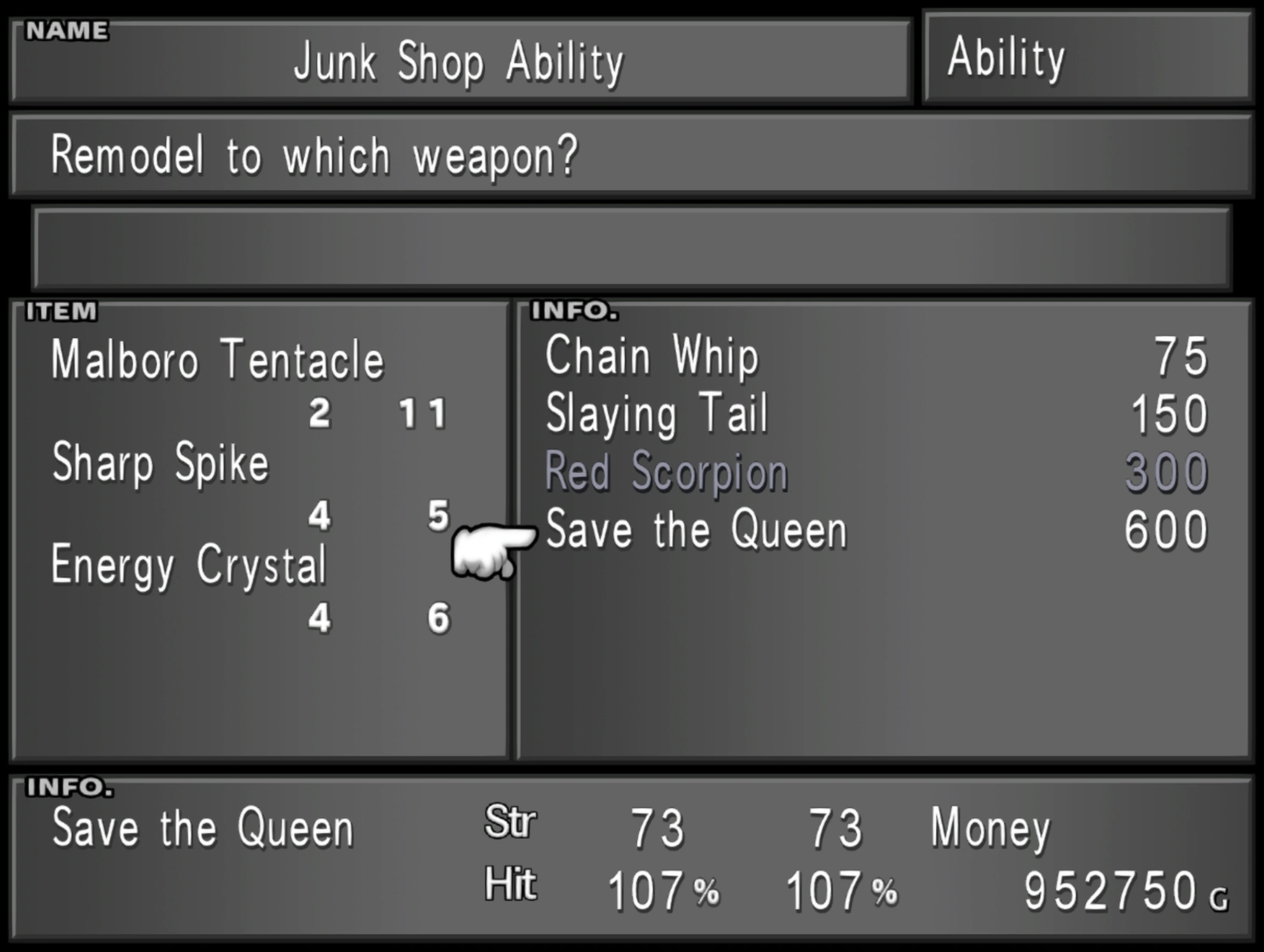 Junk Shop is a good ability to have if the player does not yet have their ultimate weapons by the time they get Doomtrain. Once the party has their ultimate weapons, further weapon remodeling is not needed as only options are downgrades. All junk shops offer the same weapon remodeling service, and so it does not matter which shop the player visits. Weapons Monthly magazines show what items are needed for weapon remodeling, but are not needed: the player can simply remodel their weapon as soon as they have the right ingredients.