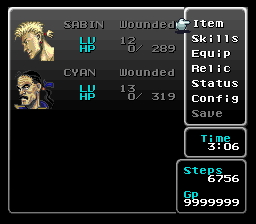 On most other occasions where the player's party is changed or someone leaves the party, the party will be fully healed afterward. This includes when Shadow leaves on returning to Narshe and when Celes leaves in the Magitek Research Facility. This same kind of failsafe was attempted at Baren Falls, as Sabin and Cyan will be fully healed when they leap down the falls, but until then they are KO'd and the player can exit to the world map and get into a battle with them in such a state.
