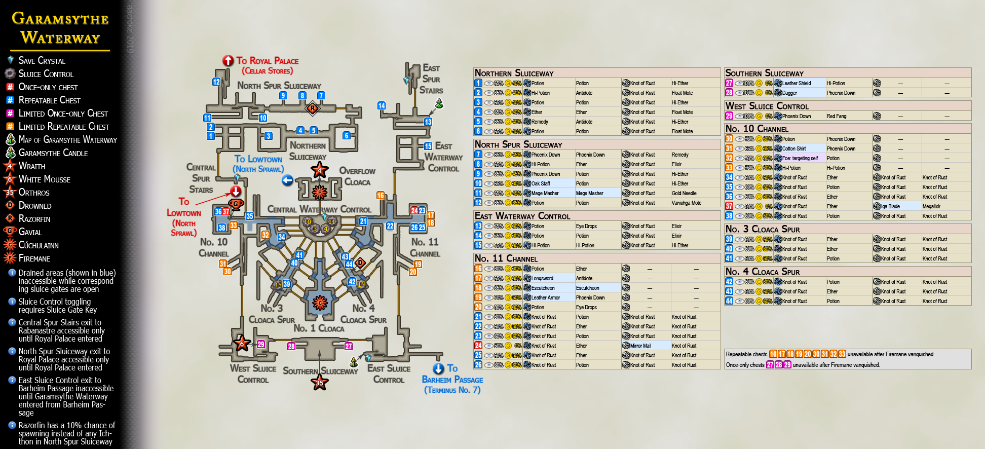 In the original PlayStation 2 version, the Leather Armor is sold for 500 gil in Rabanastre and Barheim Passage, and found as a treasure in Garamsythe Waterway's No. 11 Channel (Flooded) (70% chance to appear, 50% chance for gil, 50% chance the item treasure is Leather Armor