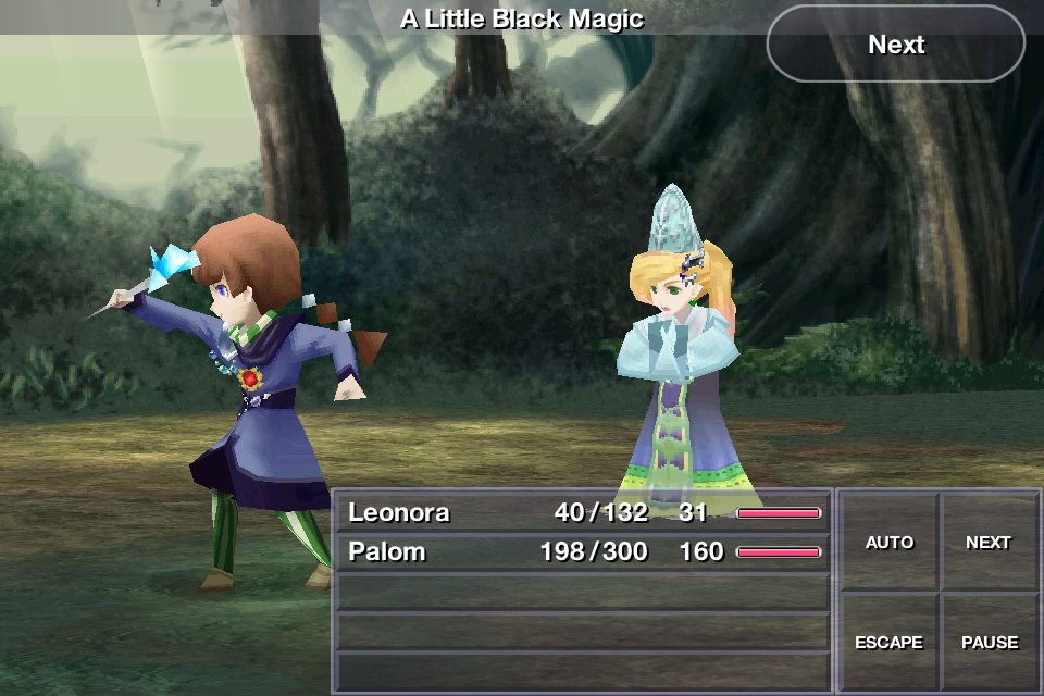Leonora learns her magic later than the other characters and cannot learn the Black Magic spells Quake, Bio, Toad, Pig, Warp, Break, Death, Tornado, and Meteor.