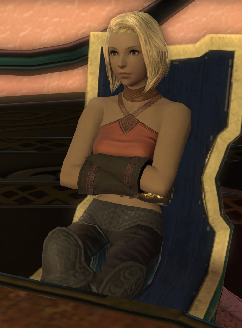 After the Calamity, Lewena spends her days at Manderville Gold Saucer challenging other players in Triple Triad matches and eventually looking for a worthy mahjong opponent. Her handmaiden remains at her side, but cannot be conversed with.