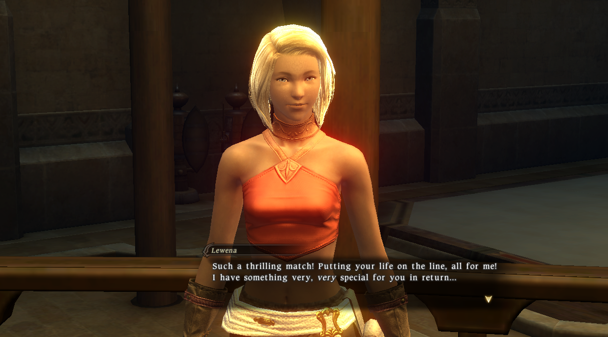 Lady Lewena is the wife of a prosperous merchant and trader, and spends most of her time in the Platinum Mirage seeking thrills. When the adventurer is sent to collect a debt from Lewena, she asks the adventurer to entertain her in the Coliseum before payment is made.[1]