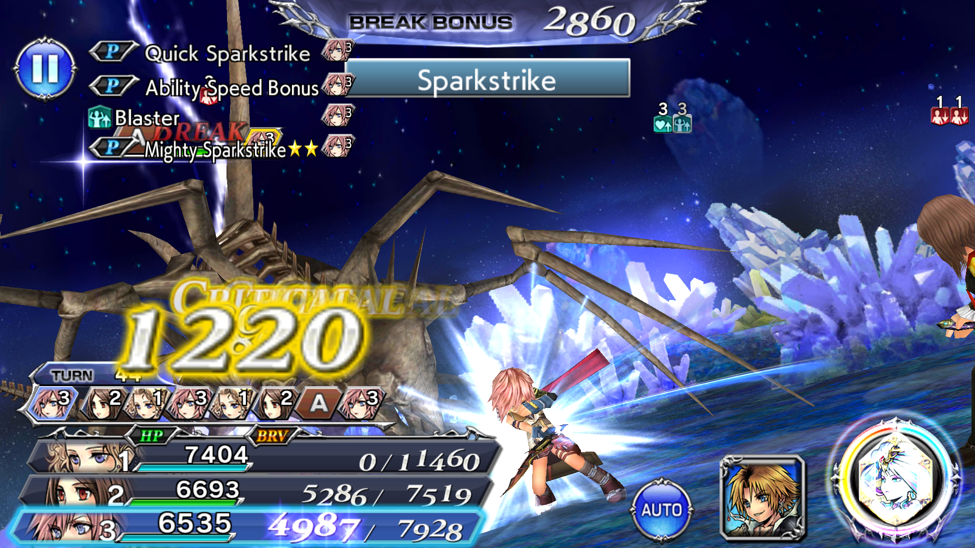 | 3-hit Melee BRV attack + HP attack 3 times Increases BRV by 50% of HP Damage dealt after each HP Attack Grants 1 level of RavagerRavager upgrades BRV Attack to BRV Attack+ (Ravager) or BRV Attack++ (Ravager), HP Attack to HP Attack+ (Ravager) or HP Attack++ (Ravager), Flourish of Steel to Flourish of Steel+ at level 2 for 6 turns Sparkstrike+:
