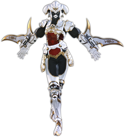 Livia is a woman in a suit of an imperial officer's black and white armor. She wears a unique helmet that bears the visage of a one-eyed woman. She wields a pair of gunbaghnakhs called Aglaea that have been welded to her armor.