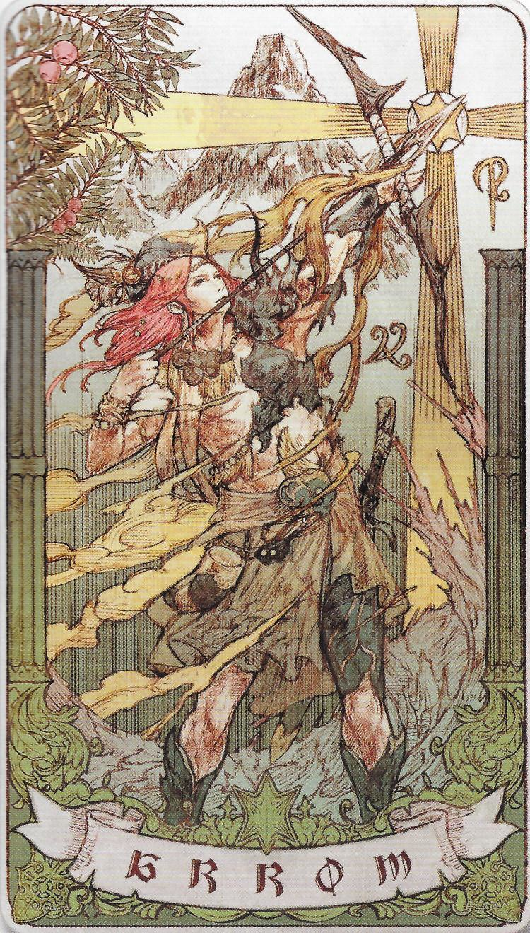 The Arrow represents the Heaven of Wind, the card artwork depicts Oschon shooting his arrows loaded with wind, with one of his mountains and the sea of Llymlaen in the background, the symbol of both can also be seen in the background.