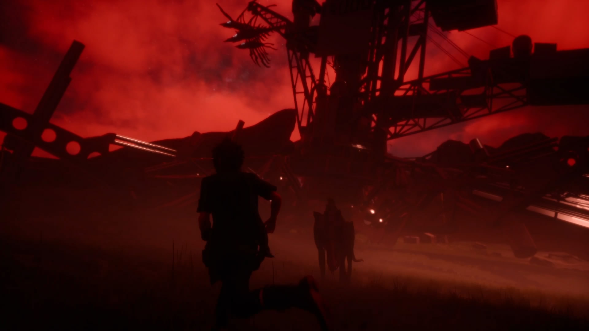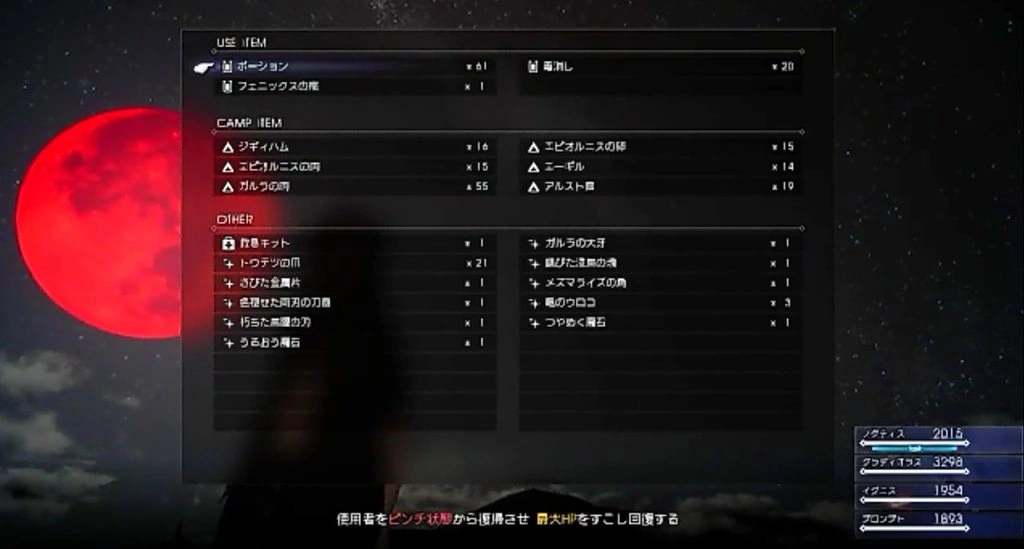 In pre-release materials, the world was seen clouded in a red hue with daemons circling the skies. This is likely an earlier version of the long night. Using an out of bounds glitch in Final Fantasy XV Episode Duscae also produced this effect, dubbed by many as the "red moon". In the final game, the moon is not visible when the entire sky is obscured. The moon being red to herald a cataclysmic event is a recurring theme in Final Fantasy, and also alludes to the real world blood moon prophecies.