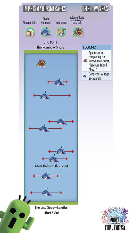 All battles in The Low Seas are engaged from the field. In the Low Seas Region, the order of the Mega Sharqual field encounters start from the Landfall area towards The Rainbow Shore.