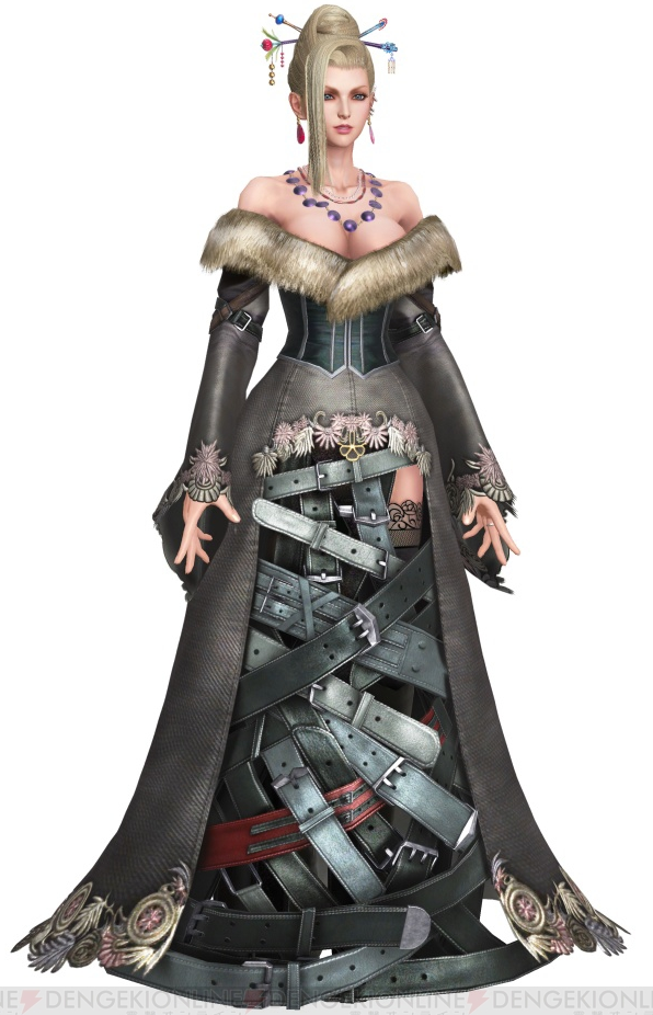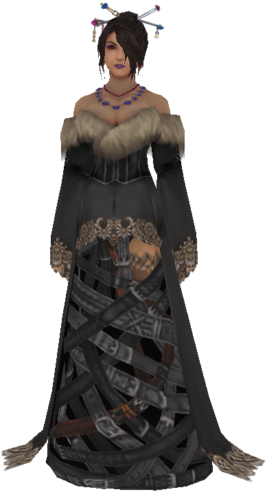 Lulu deviates from the "traditional Black Mage look" like that of Vivi Ornitier by taking on inspirations from the traditional obeah voodoo priestess and a modern day witch known for their mysterious manner of clothing, as well as the use of voodoo dolls. She wears a low-cut dark-gray and black dress that displays her cleavage (from which she pulls out items when she uses the Item command), with two crossed belts on the upper part of each sleeve. The décolletage is trimmed in fur, and the hem and sleeves have ornate lace edges. The lower front of her gown is made of a collection of interlaced belts. She wears a corset and lace-trimmed stockings.