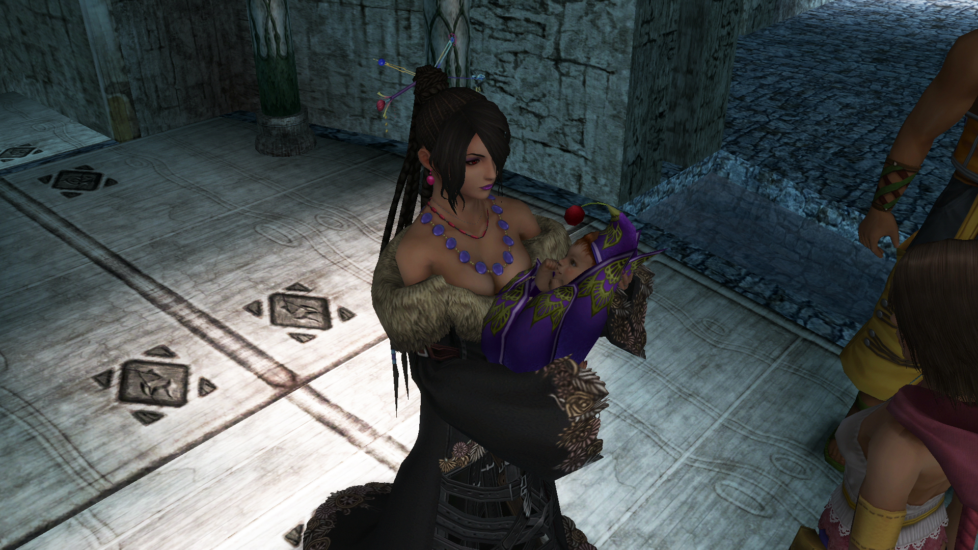 At Djose Temple, Yuna enters the Chamber of the Fayth and obtains the aeon Ixion. While waiting for Yuna, the party runs into Dona and Barthello, a summoner and her guardian who consider Yuna a rival. The former is insulted by Lulu for not knowing of Auron's identity. The next morning, Lulu points out Yuna's messy hair when she runs out in a frenzy after oversleeping. Yuna says they could have woken her up, but Lulu teases her, claiming her snoring made it difficult for the group to get through to her.