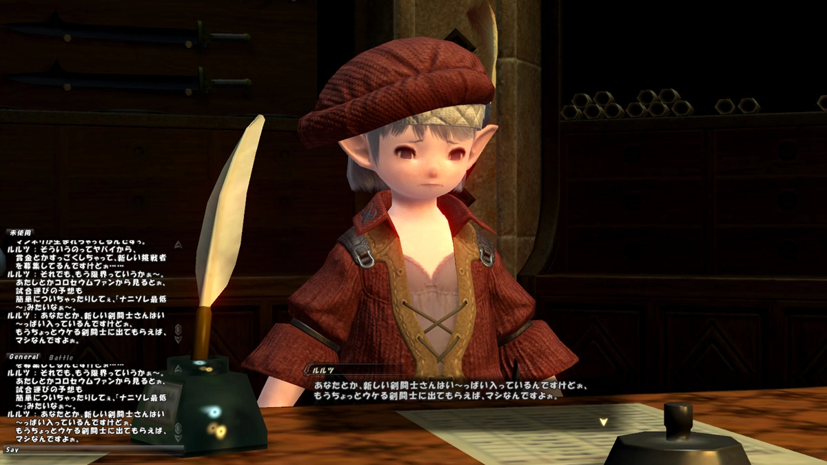 Once the adventurer joins the Gladiators' Guild, Lulutsu gives an account of the excitement of the gladiator games held in the Bloodsands. She says that the selections for the next tournament are already underway, and asks the adventurer for help in eliminating the weak from the list.[2] Lulutsu shares management's concerns about finding talented new fighters for the Coliseum . She asks the adventurer to travel to Gridania and help Yoyobina find a fighter. After they return and report their failure to bring J'moldva back to the Coliseum, Lulutsu is disappointed by the report and recalls with nostalgia the Coliseum of earlier years, when crowds would swarm and reach a riot-like frenzy.[3] Later Lulutsu contacts the adventurer with news of an opportunity to fight in Bloodsands as a gladiator and eventually delivers the reward as gratitude for the effort.[4]