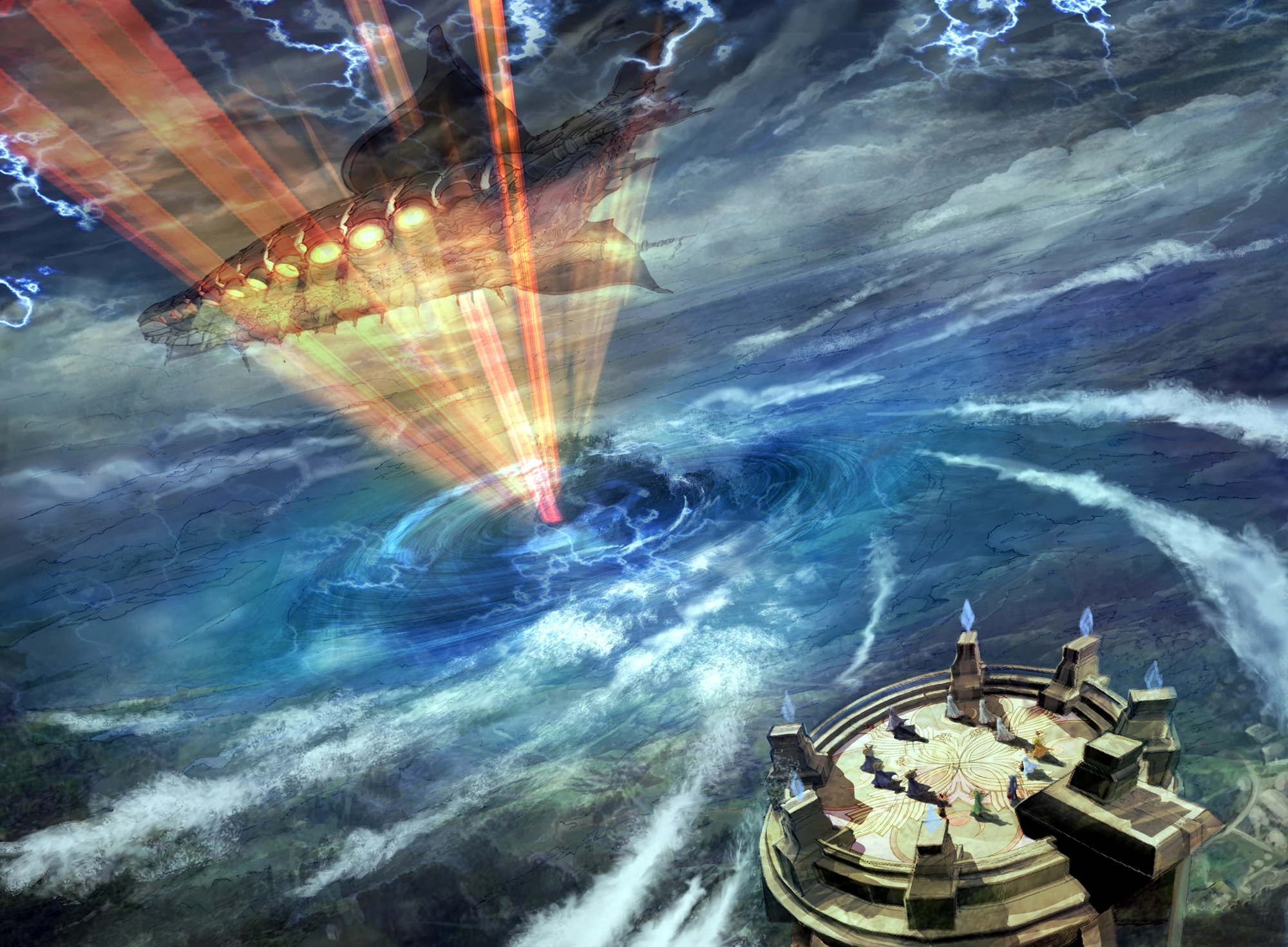 Golbez acquires the Earth's Crystals and activates the Tower of Babil to call the Giant of Babil from the moon. The elder and the mages of Mysidia pray and create a great whirlpool from which the Lunar Whale rises to ferry Cecil and his allies to the Red Moon. The airship serves as transport for the party, and after Zeromus has been felled, is returned to slumber within the waters near Mysidia.