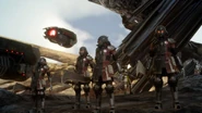 Magitek swordsmen appear in groups from dropships and can be fought on the overworld. They commonly spawn alongside imperial troopers. They are weak to polearms, daggers and lightning, and they resist fire. They attack with their saw-toothed swords for close-ranged combat and harpoon opponents with a mechanism that ejects out of their chests for targets further away. They can surround the player and harpoon Noctis who becomes incapacitated. Once the swordsman loses its swordarm, it starts to attack by kicking.
