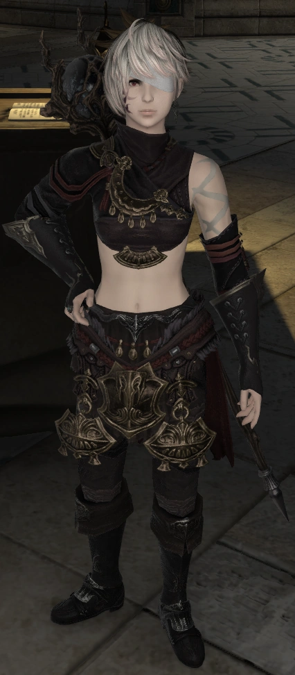 Mahaud is a hyur with short white hair. She has a bandage that covers her eye.