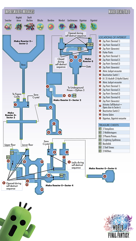 Mako Reactor 0 is a dungeon located under Figaro Castle in the Desert Region of Grymoire in World of Final Fantasy, accessed from the Underground Prison. It is the main setting of Chapter 15, "The Mako Reactor and the Black Mages".