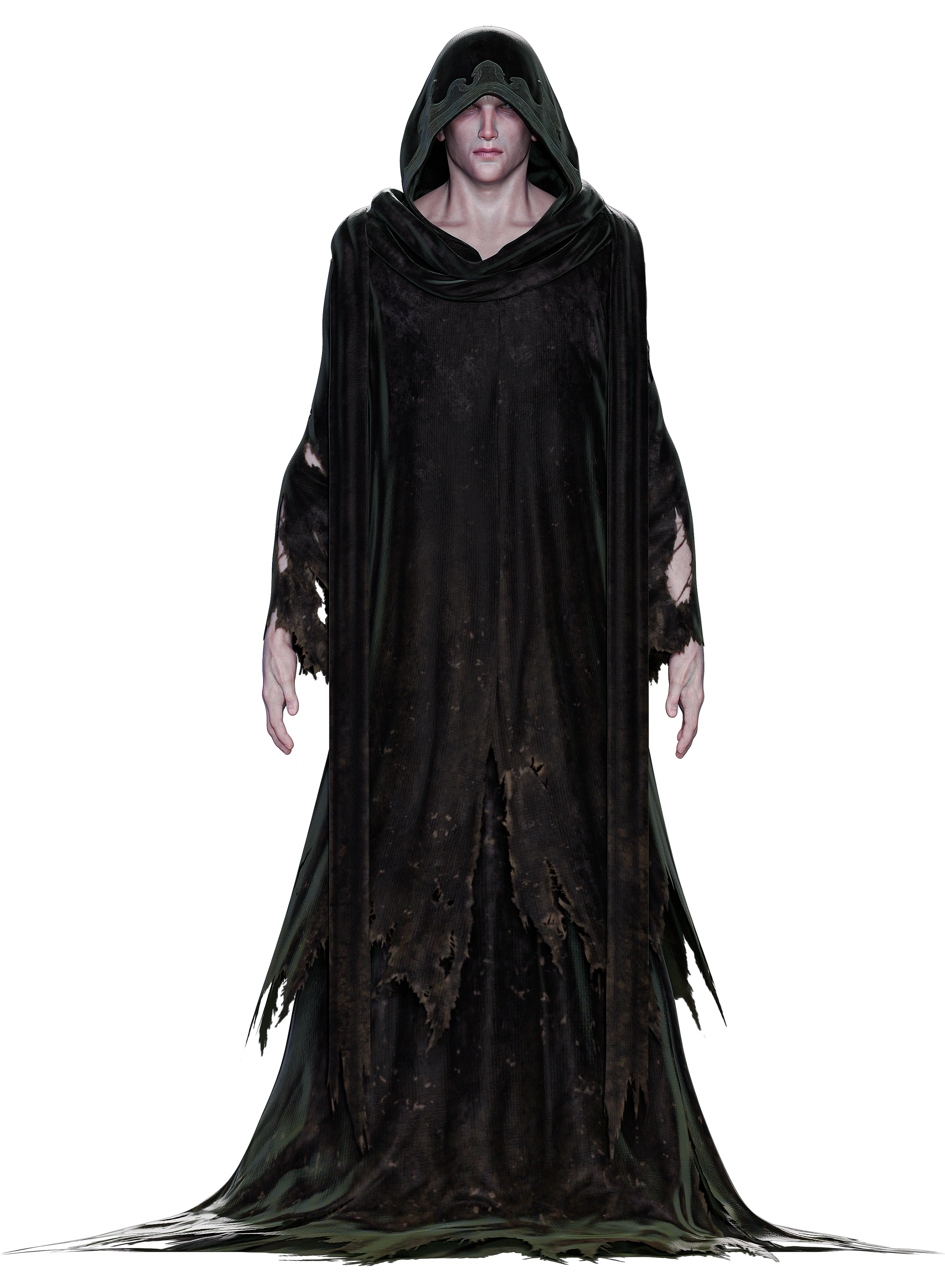 Marco is a man with pale skin that appears darkened or bruised in places, sunken features, and a bony physique. He wears a dark tattered robe and has a black '49' tattooed on his bicep. The robe has long fluttering pieces of cloth at the back, something like a cape or invoking the image of wings, that have a white symbol painted on them.