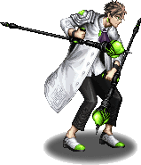 Melo is a fair-skinned man with short brown hair. He wears a white coat with emeralds on his shoulders and black pants. For combat he wields a pair of black tomfas, adorned with green jewels.