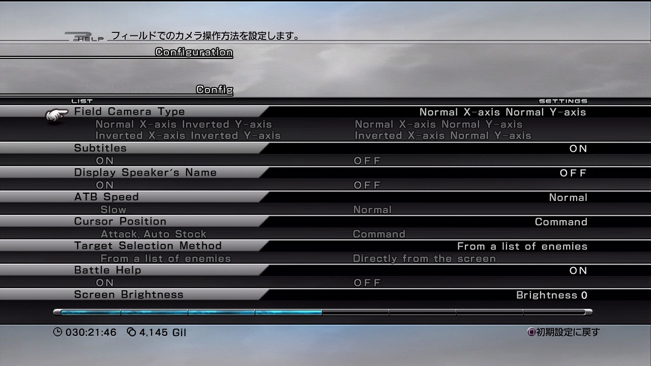 The Settings is the game configuration menu. The player can set the camera and screen brightness controls, whether the game displays subtitles or not, and whether the speaker's name is displayed when the subtitles are enabled. The battle speed can be adjusted from here as well as cursor position, target selection method and help messages during battle.