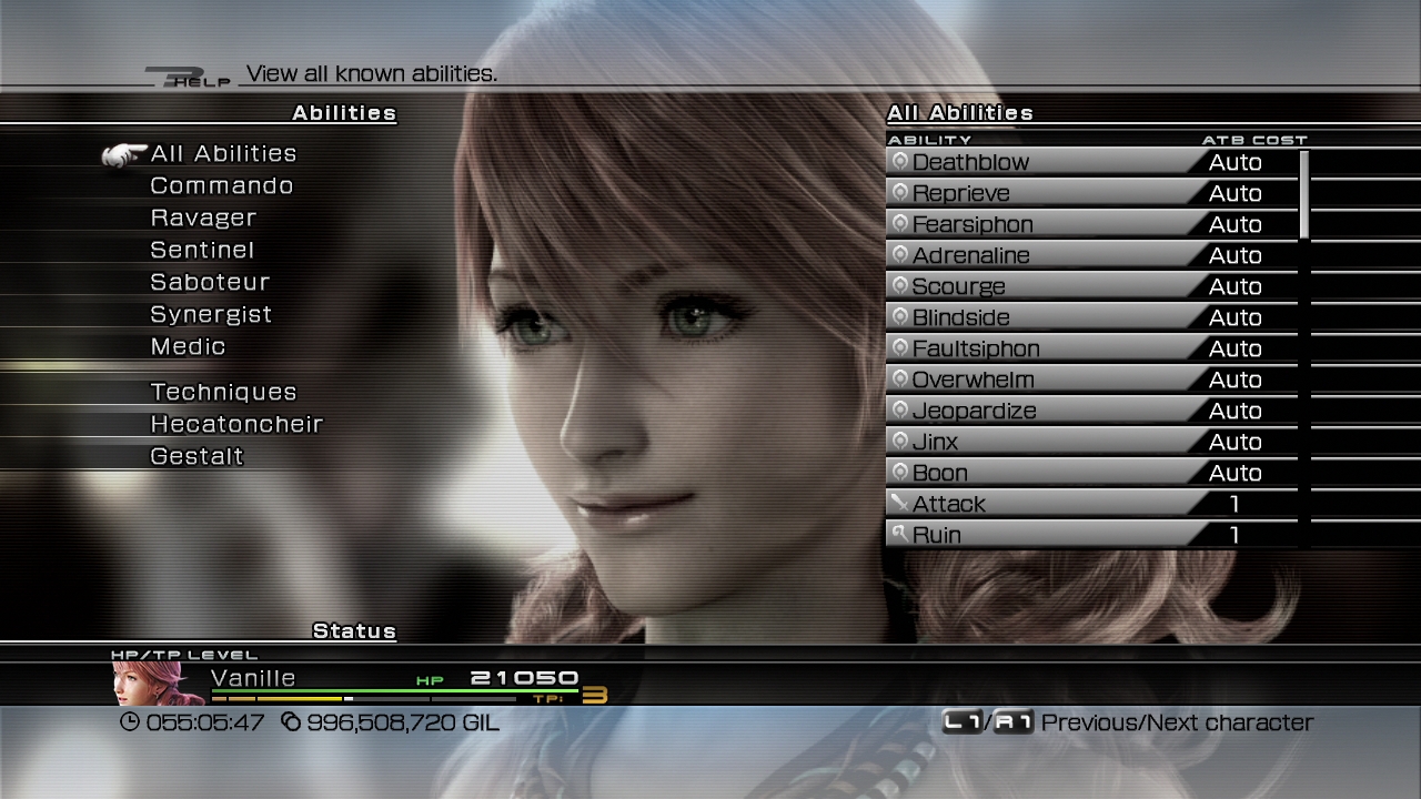 The Abilities menu displays the abilities the character has learned from the Crystarium. The player can either view all abilities at once, or in sections. The role abilities are bundled under the role that can use them, Techniques are their own section, and Eidolon abilities are displayed here as Final Fantasy XIII has no separate menu for Eidolons. The menu shows the ATB cost of abilities and the abilities marked Auto are passive.