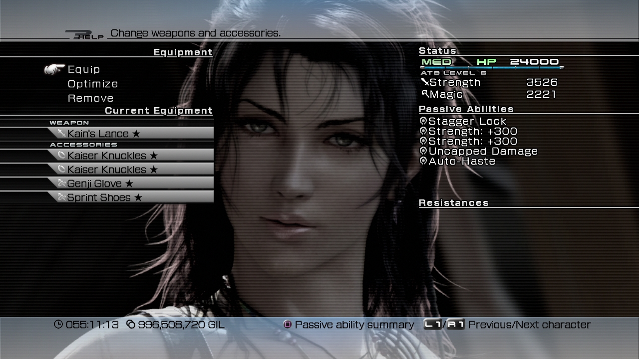 The Status menu displays the playable character's status, their stats, their equipment and passive abilities, their role levels and elemental resistance. From the Status menu the player can also view the character's Eidolon's stats after the character has obtained one; thus the Status menu doubles as an Eidolons menu, as Final Fantasy XIII has no separate menu section for viewing Eidolon stats. Unlike previous Final Fantasy games where the menu shows a character's menu portrait, the entire menu background in Final Fantasy XIII changes to display the character who is being viewed.
