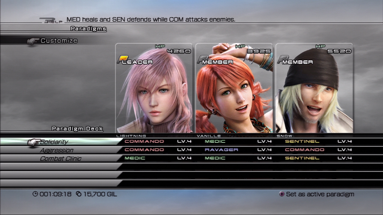 In the Paradigms menu the player can set the party's paradigms to be used in battle. The player can preset up to a maximum of six paradigms. With six roles and three maximum playable party members, there are 83 different paradigms in total. Each playable character has different roles unlocked, and different Crystarium path in their roles, meaning that choosing different characters for the party affects the usefulness of the set paradigms in different battle situations. It is possible to set the same paradigm multiple times on the table. In battle the party can then shift between the paradigms freely.