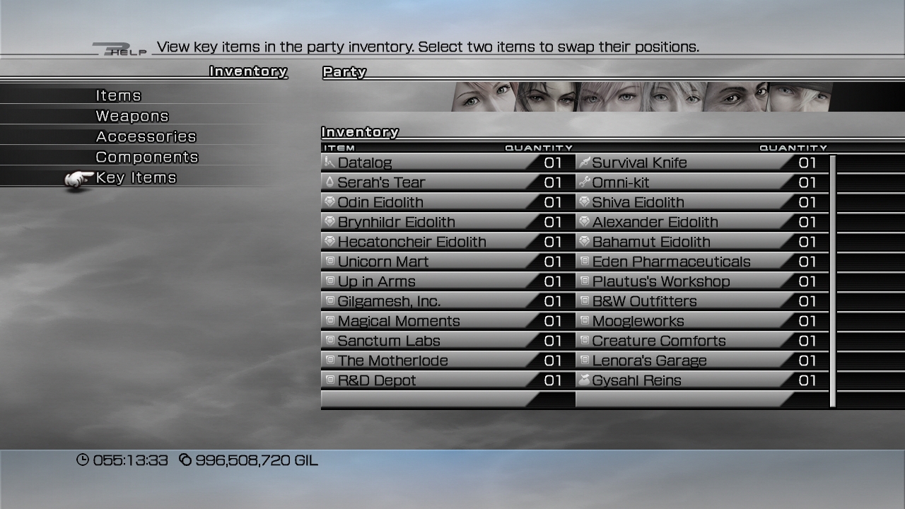 The inventory is made out of Items section, that is for normal battle items like Potion and Antidote, Weapons and Accessories cover the equipment, Components is a list of equipment upgrade items, and key items shows all other items, such as storyline items, the characters' eidoliths and what Retail Network shops the player has obtained.