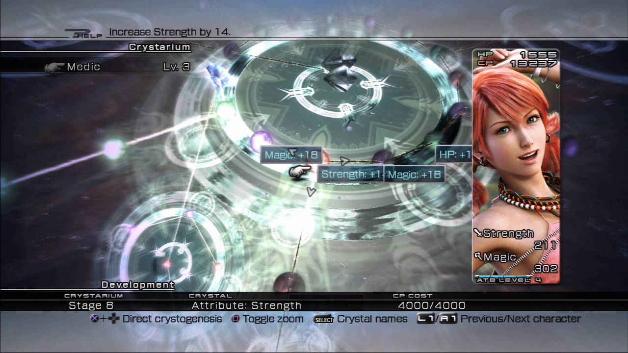 A character's Crystarium expands by expending Crystogen Points obtained from battles. After choosing a character to advance and a role they have available from the menu, the player must press the confirm button to activate crystals in the Crystarium. The player can browse the Crystarium in the menu with the directional buttons to see what stat boosts and abilities are coming up next. The Development section at the bottom of the screen shows the Crystarium stage, the basic attribute of the crystal being highlighted and the CP cost the crystal requires to be activated. The character's stats are displayed over their menu portrait on the right, so the player can see the effect of activating crystals in the system first hand.