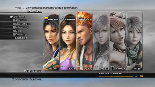 The following entails the contents of the main menu in Final Fantasy XIII. The menu has a blue-gray color-scheme and black-and-white images from the game are often imposed on the menu background depending on the submenu being viewed.