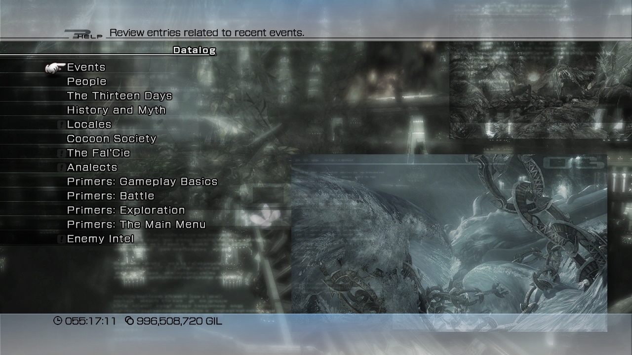 The Datalog in Final Fantasy XIII has thirteen submenus: Events chronicles the game's events chronologically listing them by chapter; People contains character profiles and updates with new revelations about them; The Thirteen Days is full of recordings all the events that happened thirteen days up to the prologue of Final Fantasy XIII; History and Myth expands on the history and mythology of the game world; Locales records profiles of the game's locations; Cocoon Society provides information on Cocoon and its denizens; the Fal'Cie section keeps track of information of the fal'Cie mentioned within the game; Analects are stories and myths recorded by the Gran Pulse civilization.
