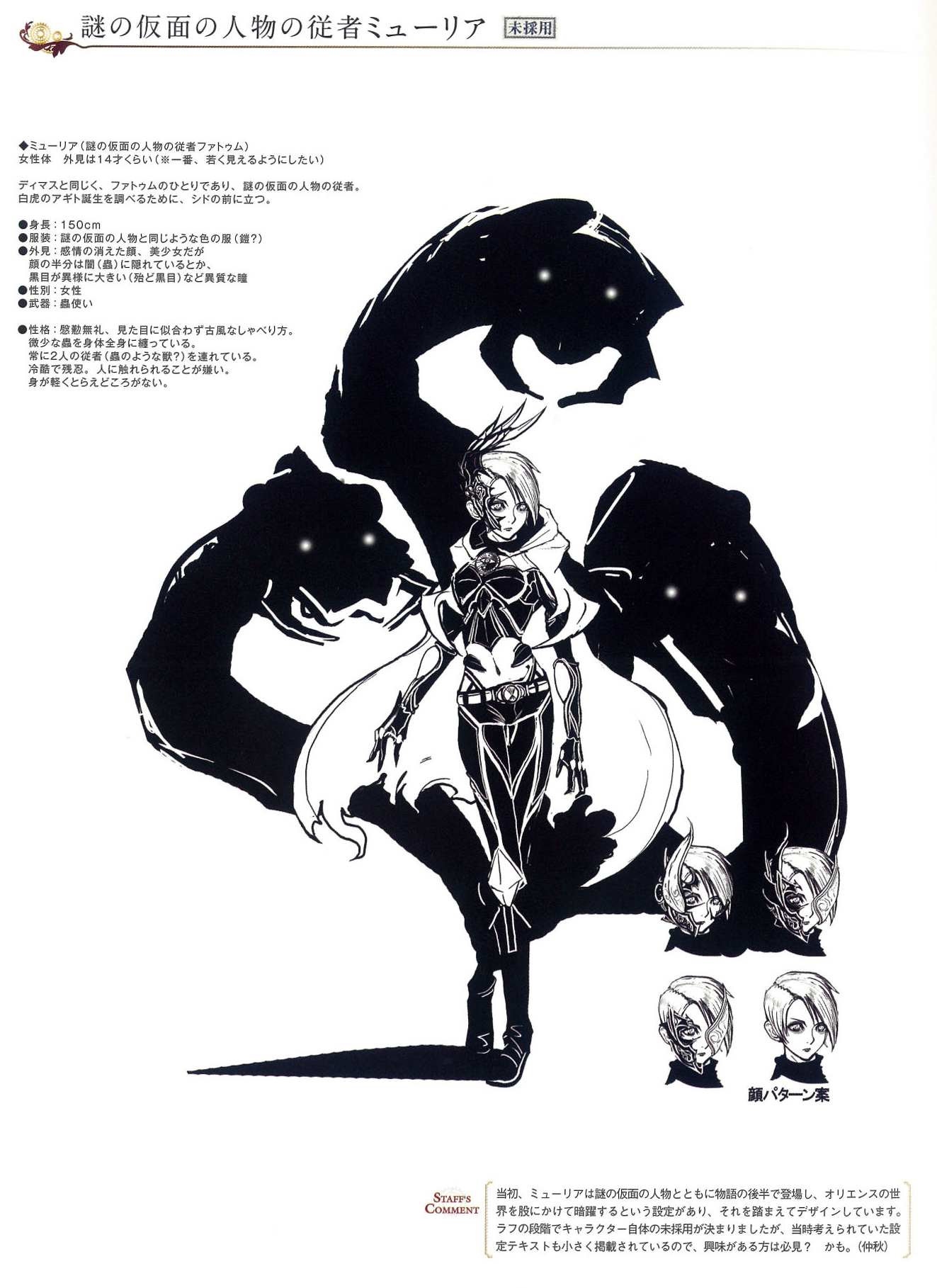 Myuria is a girl around 14 years of age. Half of her face is covered with a mask. She uses worm-like creatures as her weapons. Originally, Myuria was set to appear alongside another mysterious masked man in the second half of the game after Tempus Finis comes upon Orience. However, the developers decided to scrap the character.