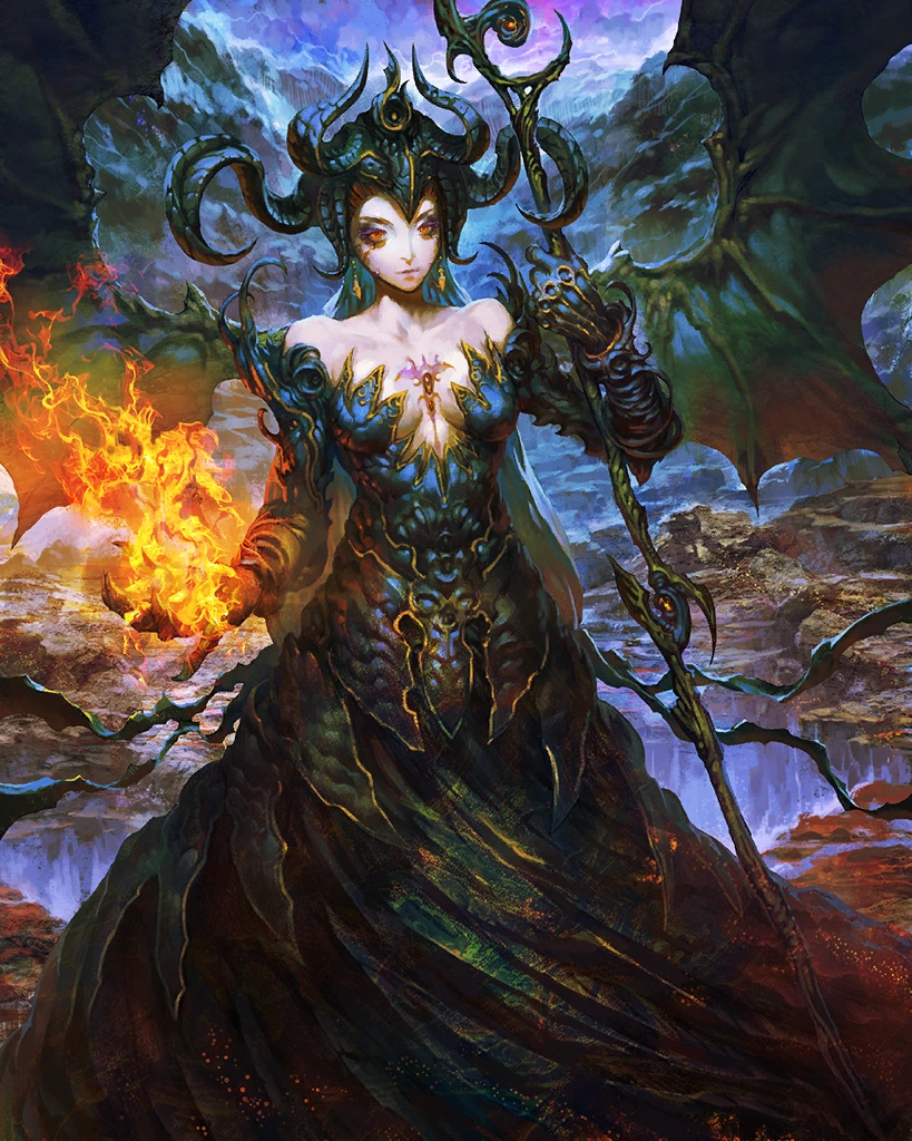 | A dark goddess whose domains are night and temptation. This rare card can only be obtained through summoning. Creates water and dark skillseeds. Artist: Christoph Peters | ||||