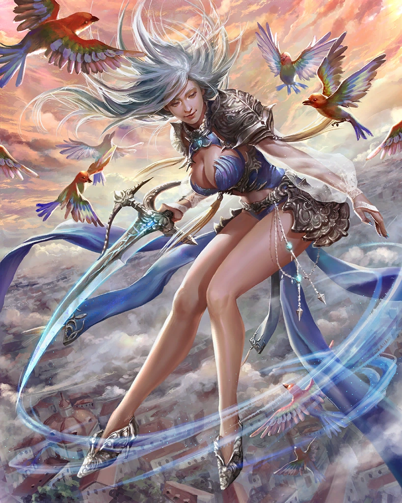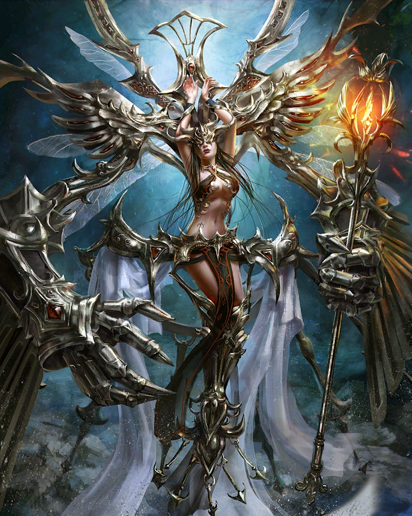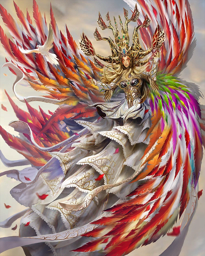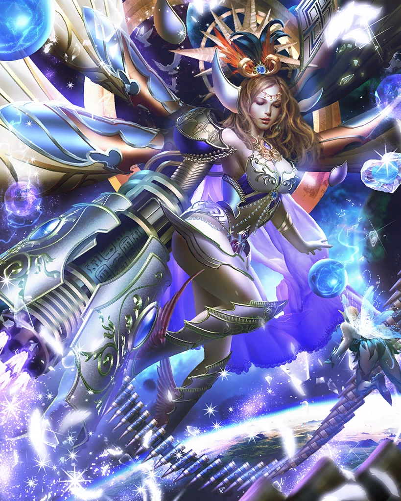 The silver-armed queen of a celestial court. This rare card can only be obtained through summoning. Creates light and water skillseeds. Artist: Buddy Jiang | |||