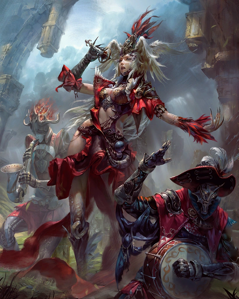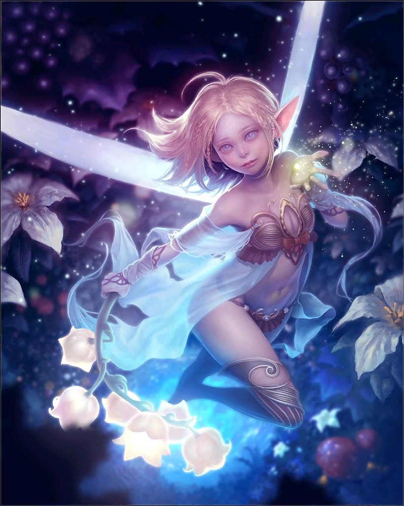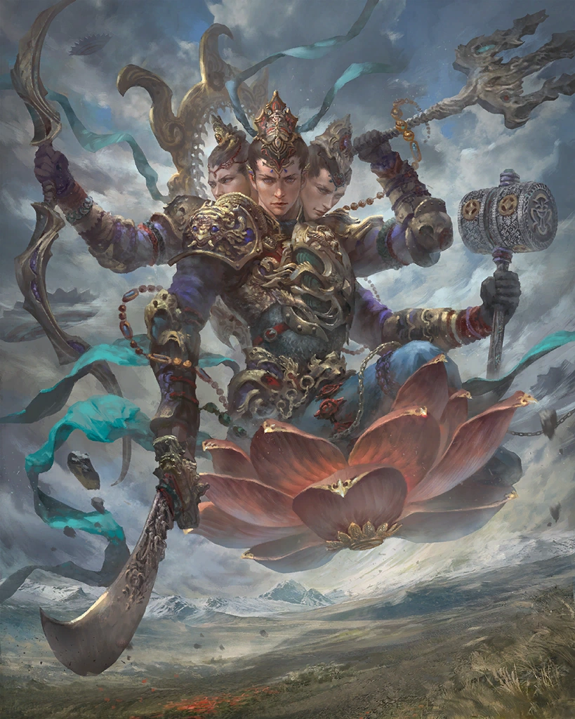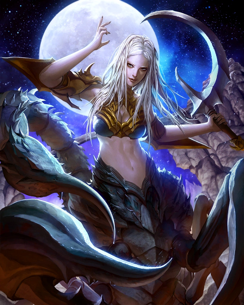 The silver-armed queen of a celestial court. This rare card can only be obtained through summoning. Creates light and water skillseeds. Artist: Buddy Jiang | |||