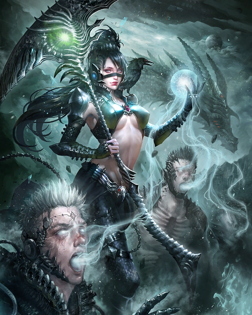 A mistress of death, whose irresistible beauty makes willing servants of any who behold her. This rare card can only be obtained through summoning. Creates a great number of water skillseeds. Artist: Lasahido | |||