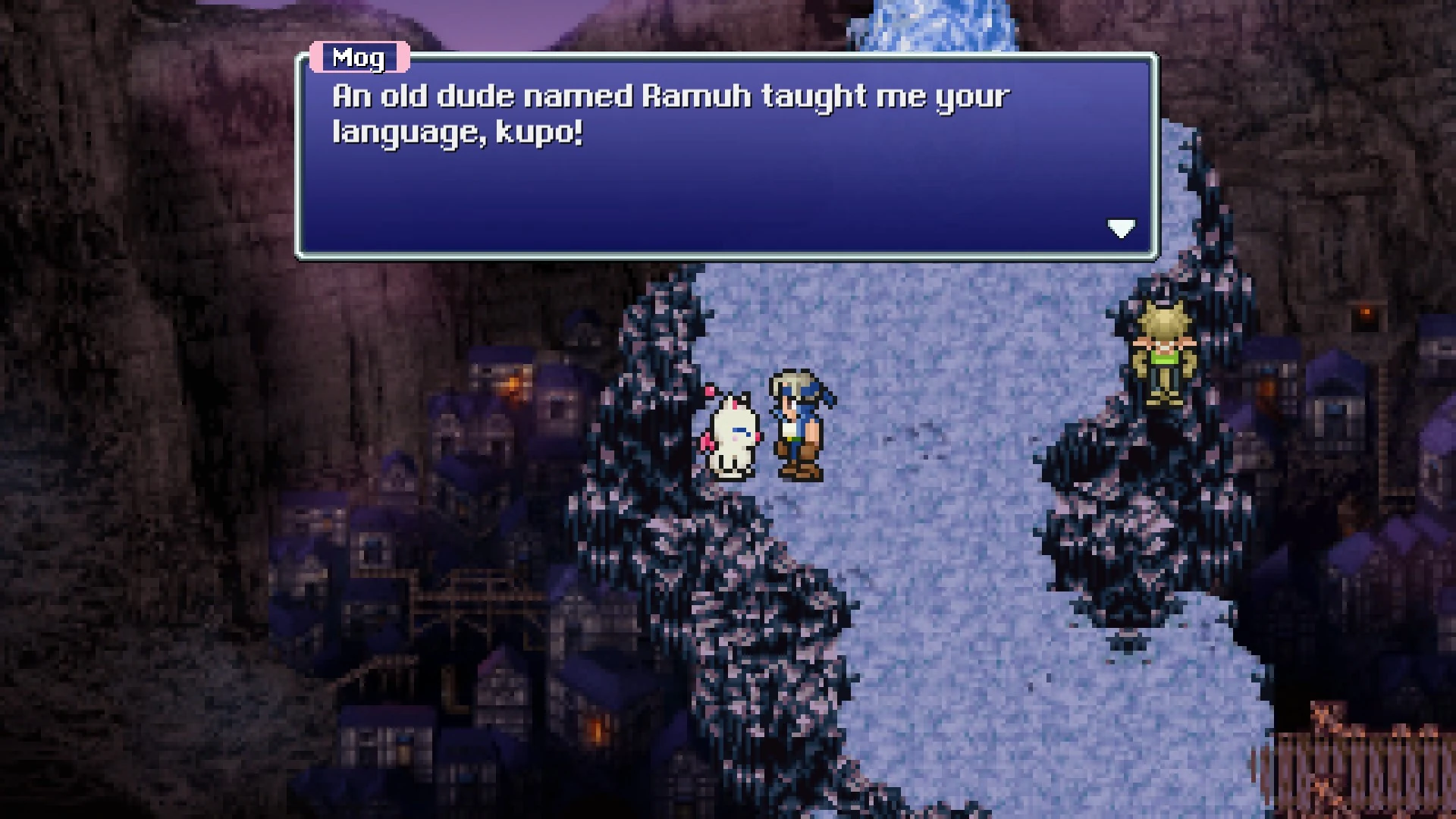 After the party raided the Magitek Research Facility and returned to Narshe, they heard the thief Lone Wolf the Pickpocket was in town. When they found Lone Wolf he fled to the Narshe Cliffs. He held Mog hostage, demanding the party let him go, but Mog struggled and threw the two to the sides of the cliff. The party pulled Mog to safety, and he thanked them, revealing his ability to talk. He told them Ramuh had come to him in dreams to teach him how to talk and told him to join the Returners and help them. Lone Wolf, indignant over the party leaving him, let go of the cliff. Mog went to the airship to wait for the others. After the party escaped the Floating Continent, the Blackjack was destroyed and the party was scattered across the world.