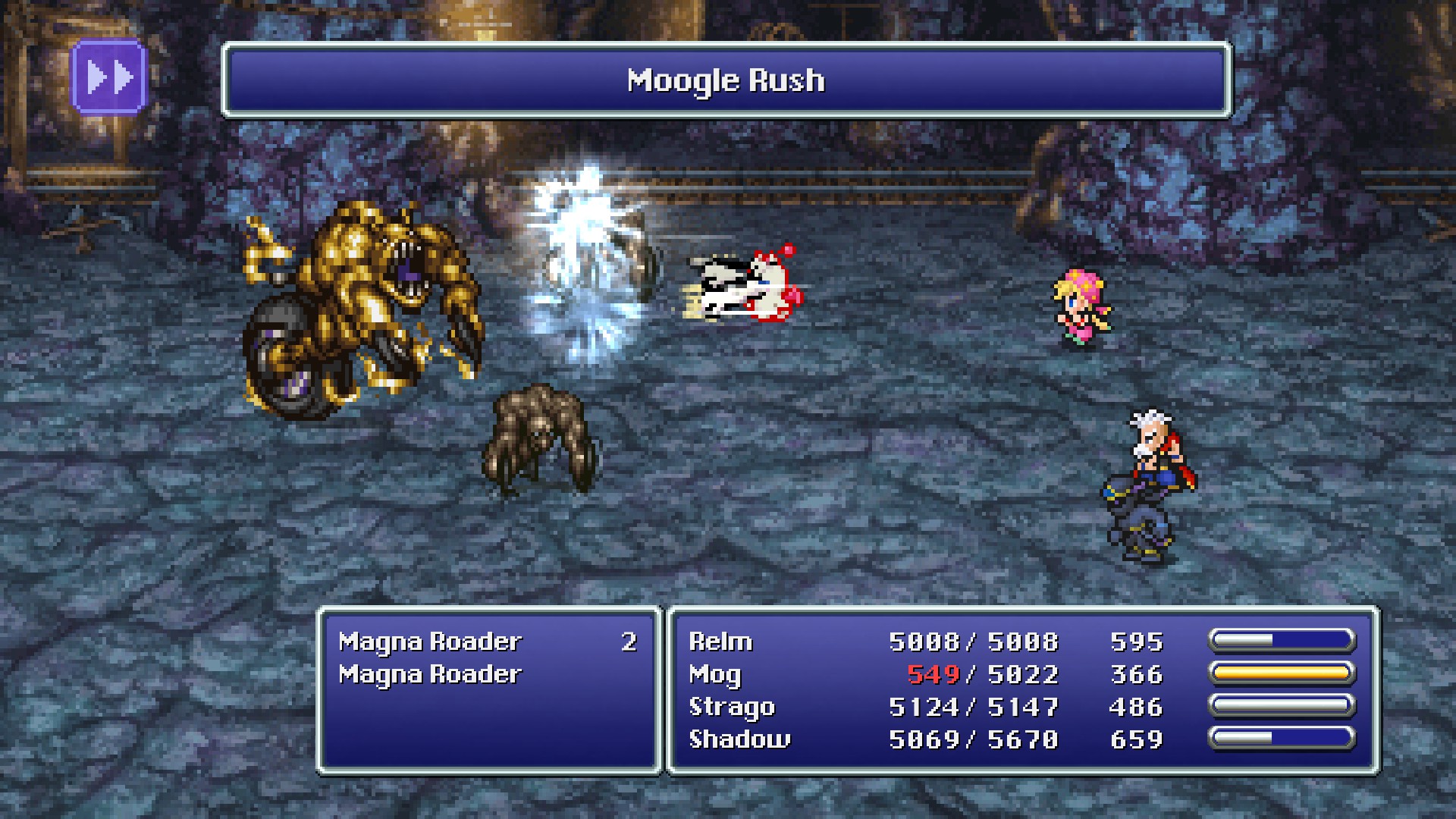 As the party escaped Kefka's Tower at the end of the game, Mog and Edgar entered a room when the floor collapsed; Edgar jumped onto a catwalk, but Mog was left hanging over a pit. Edgar used a crane arm controlled from the catwalk to grab Mog and get him to safety, all the while Mog grumbling at the crane messing his hair up, proclaiming he isn't a stuffed animal.