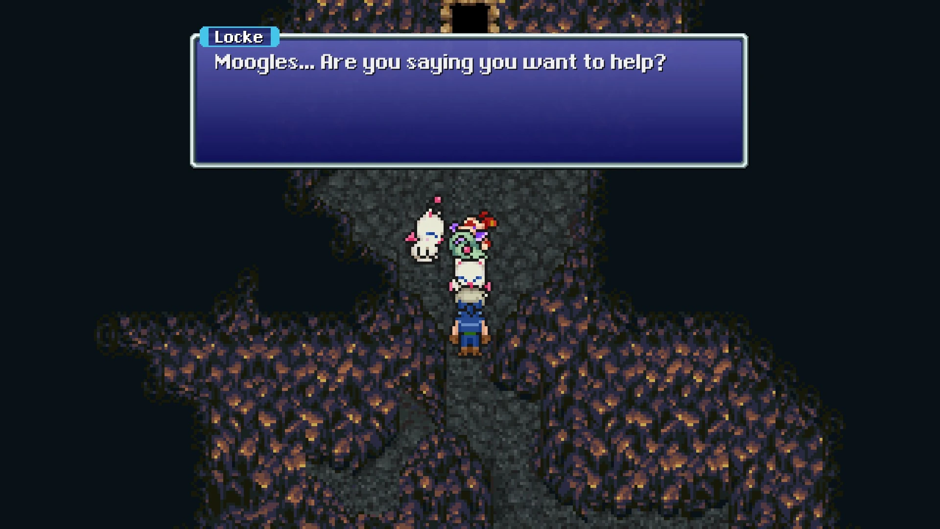 When Terra was fleeing the guards of Narshe through the mines she fell through a collapsed floor and fainted in front of the moogles' lair. Locke came to rescue her and found her at the same time as the guard leader. Mog and ten other moogles emerged from their lair and helped Locke, surprising him. The guard leader was defeated and Locke took Terra to safety.