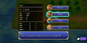 Upon leveling up, the player gets to choose a training regimen for Sumo, selecting the Monk focusing on improving DEF and increasing HP. On the level up screen, it uses the Monk artwork of the sprite from the 2D version of Final Fantasy III.