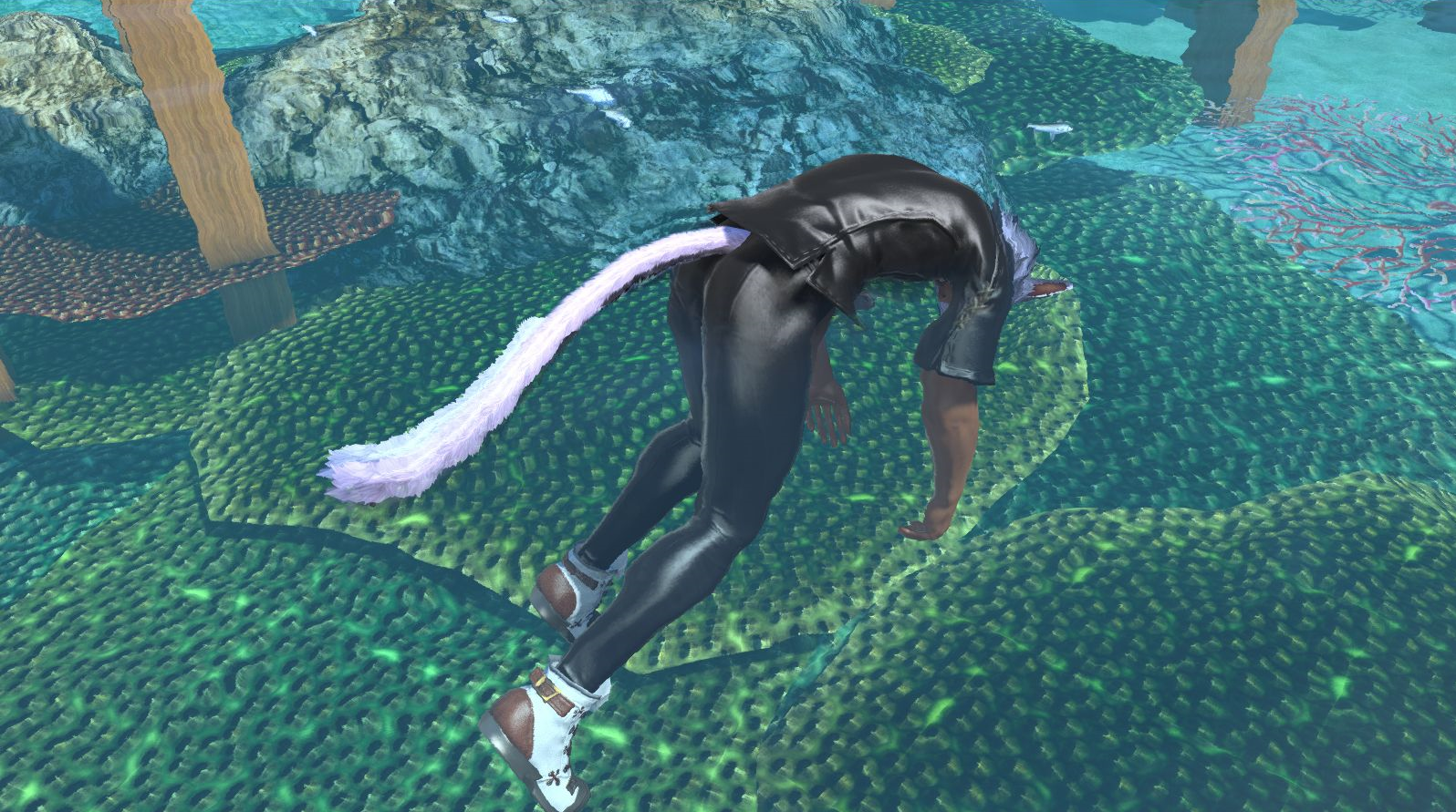 After Warrior of Light has completed the challenge, R'fhul Tia eagerly prepares for his own attempt. R'majha rushes ahead to find a spot from where the two of you can watch her brother's acrobatics. Immediately after placing his foot on the starting platform, R'fhul Tia steps forward to make the first jump. Unfortunately, he immediately falls into the water below. After dragging himself to the beach, R'fhul Tia regains his composure and tries to hide his embarrassment with laughter. His sister is offended by this and leaves in a rage without explaining the reason for her anger.[4]