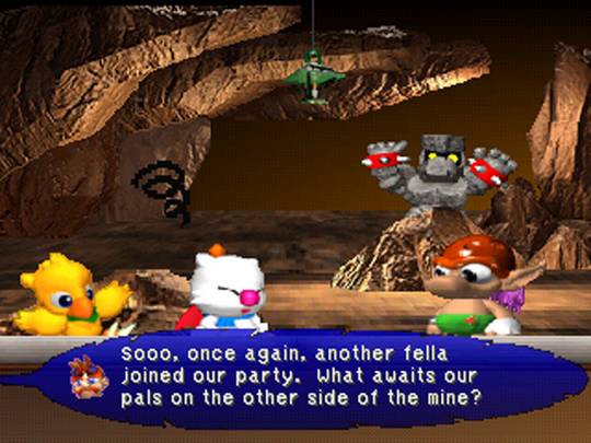 During Story Mode, Chocobo, Mog, and Golem wind up in the Mythril Mountains when they encounter a Goblin bandit who takes Mog hostage and demands for their money. When they notice that Goblin has a blue crystal on his right ear, he challenges them to a race, lest they forfeit their blue crystals over to him.
