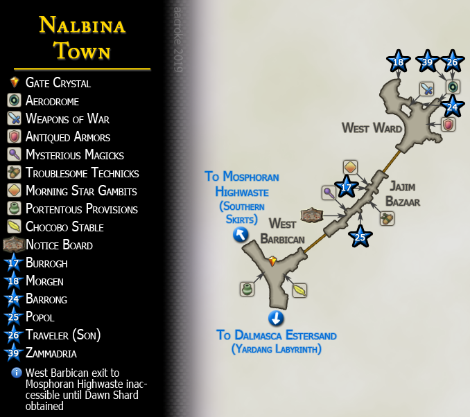 After the imperials took control of Nalbina Fortress, it is now primarily used as a prison. The city itself has been rebuilt, and now contains a thriving market and an airship dock. Soldiers are plentiful, guarding the access to Mosphoran Highwaste, and those wanting to visit the aerodrome are escorted through the fortress.