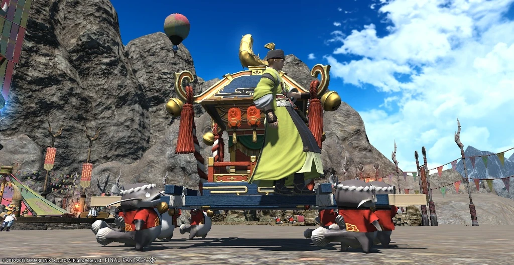 A mount of eight Namazu carrying a celebration mikoshi can be obtained from the Namazu tribal quests for 12 koban. When flying, the Namazu dangle off the wooden beams. A golden mikoshi, known as the