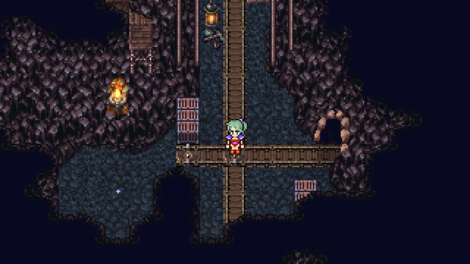 The eastern exit from the main room leads to the rest of the mines, which follow a linear path up to the Narshe Cliffs. The mines consist of three rooms interspersed with segments where they open onto the cliffs and then back inside. The final pass opens on the top of the mine cliff face with an exit to the Narshe Cliffs directly north.