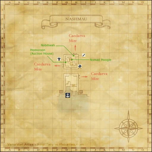 Nashmau (ナシュモ, Nashumo?) is a solitary settlement on a mist-shrouded island in Final Fantasy XI. Once a supply base for the Imperial navy, it was abandoned after a plague descended upon its population; the Qiqirn have since taken the town as their own. The diminutive beastmen have reopened a section of the port in order to trade with fishermen and other visitors to the Arrapago Islands. To the east of Nashmau lies a stretch of mudlands known as the "Deadmist Marsh".