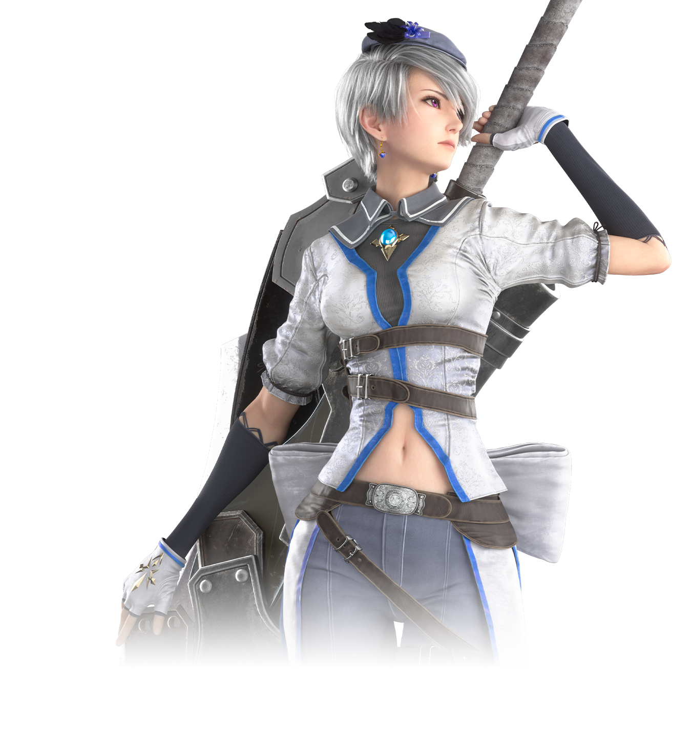 Nerine bears a similarity to Princess Swan. She has short sliver hair with a blue beret, purple eyes, blue earrings, a white shirt with a blue brooch which exposes her navel, fingerless gloves, and grey pants with long thigh high boots.